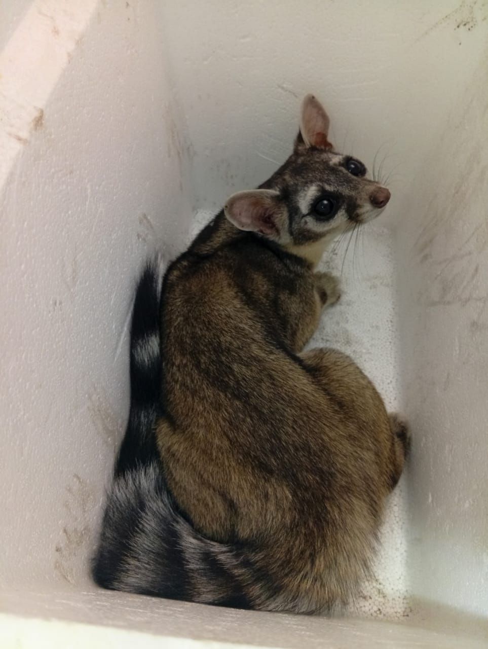 Gracias a la colaboración de la propietaria del inmueble, el ejemplar (miembro de la familia de los mapaches), fue resguardado y liberado en un entorno adecuado para su desarrollo y supervivencia.